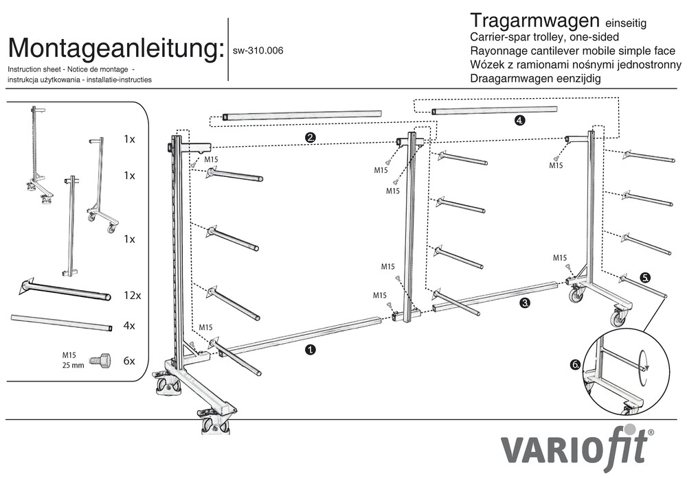 - cărucioare tip rafturi în consolă patru roți pivotante, două cu sistem de blocare și VARIOfit® protecție pentru picioare, una cu blocare de direcție