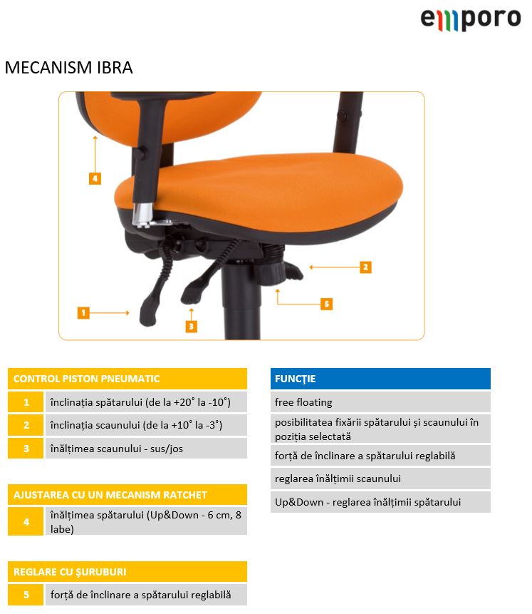 - înclinare continuă a șezutului (-3° până la +10°) și spătarului (80° până la 105°)